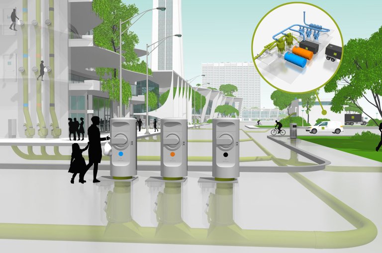 Miljøstasjonen blir et sentralt bygg der avfall fra de ulike byggene transporteres gjennom et underjordisk rørsystem – et såkalt vakuumsystem. Avfallet sorteres i fire ulike kategorier som hver har ulike nedkast: Papir, plast, rest og mat. Avfallet suges automatisk fra innkastpunkter i byggene og samles i ulike containere i miljøstasjonen - det sorterte avfallet blandes ikke. Når containerne er fulle hentes de med lastebiler og kjøres til gjenvinning/avfallshåndtering.